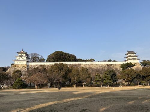 JR明石駅のホームに降り立つと、北側に「明石城」が見えます。 少し距離はあり、福山城のように駅の真横ではありません。 それでも、2基の現存三重櫓(坤櫓・巽櫓)と、その間を横一直線につなぐ現存・復元された長い土塀がつくる連続した構えは、 遠目でも…